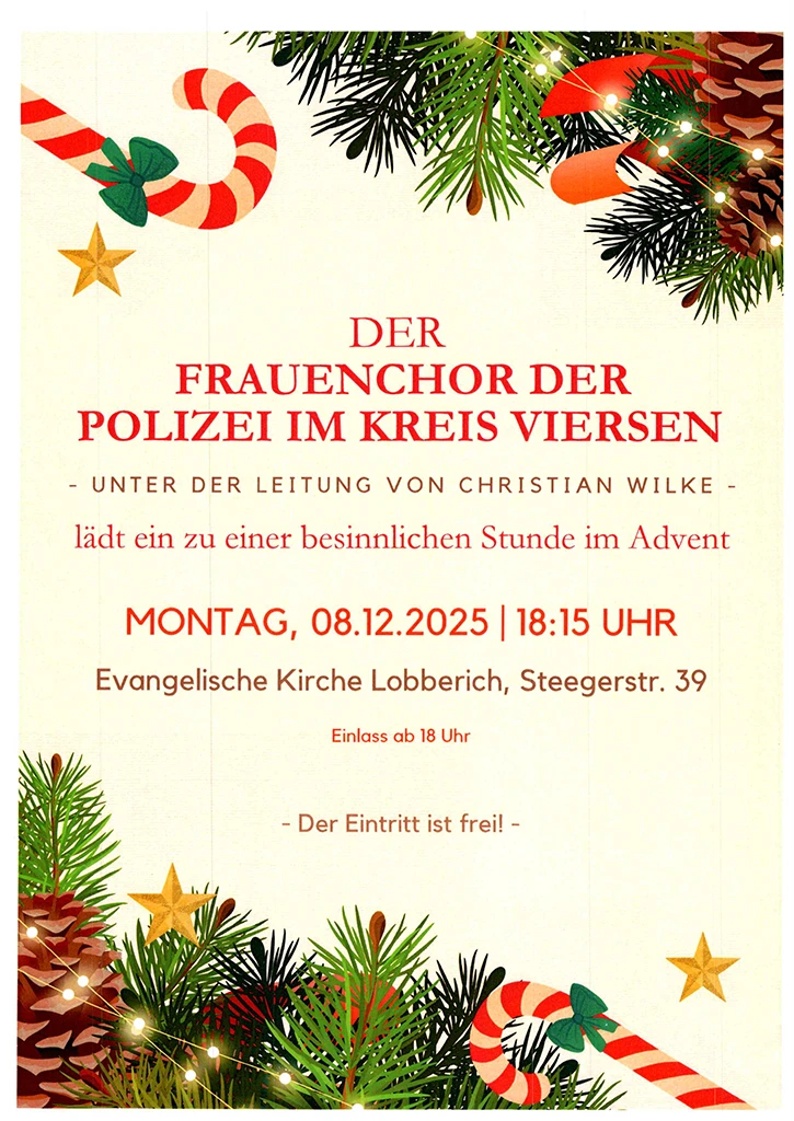 Der Frauenchor der Polizei im Kreis Viersen unter der Leitung von Christian Wilke präsentiert Ihnen Anfang Dezember ein sorgfältig ausgewähltes Programm aus besinnlich gestimmten Liedern. Ebenfalls laden wir Sie zum Mitsingen von bekannten Weihnachtsliedern ein.