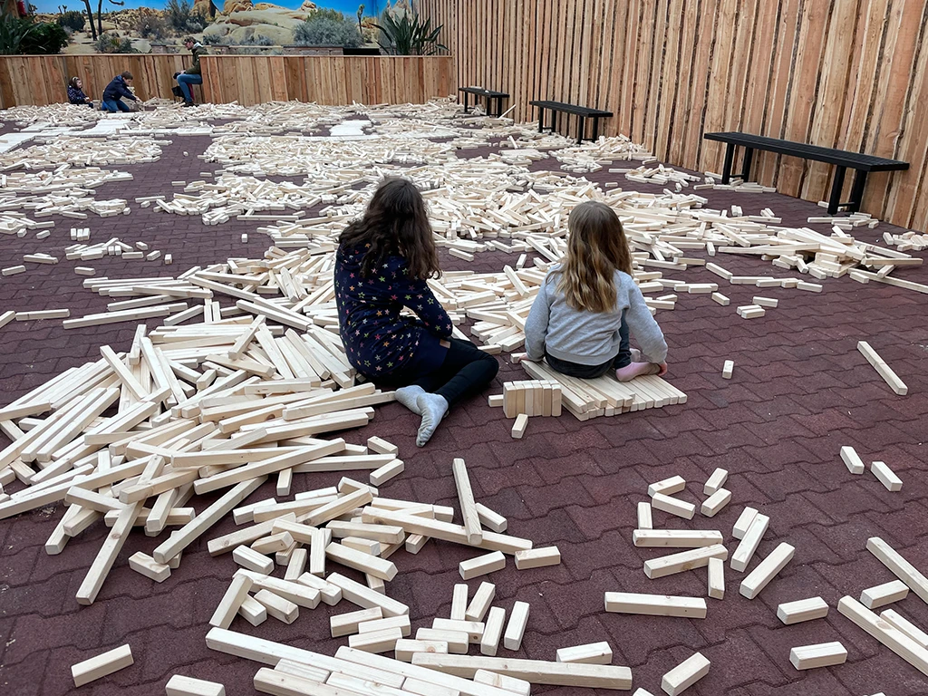 Kinder sitzen auf dem Boden und spielen mit einer flachen Kugelbahn, die aus verschiedenen Modulen zusammengestellt werden kann.