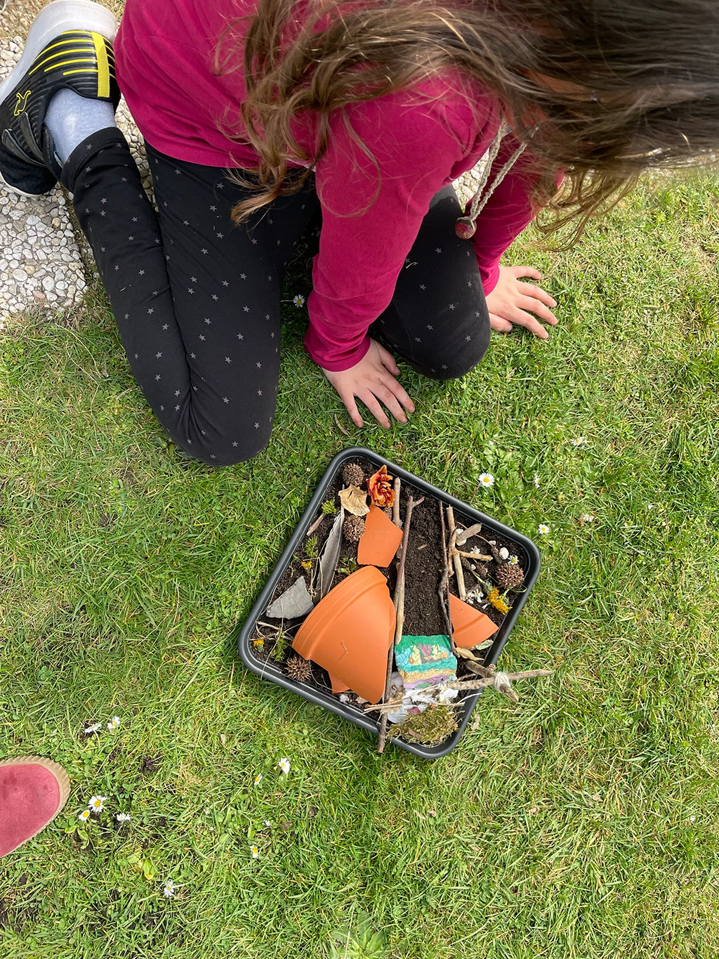 Kind mit einer Schale, in der ein Minigarten mit Erde, kleinen Ästen und Tonscherben ist.